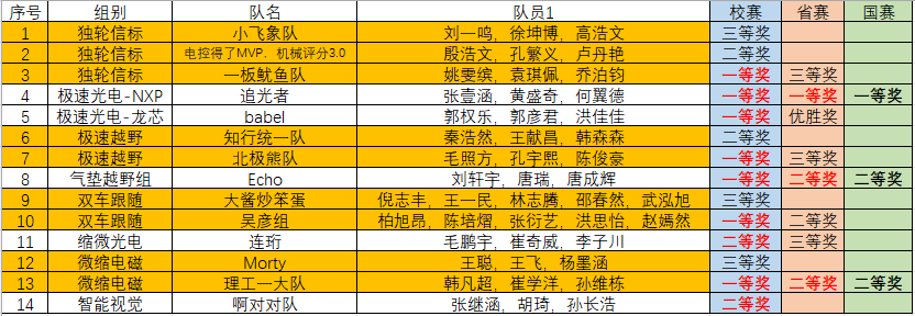 在全国总决赛中,极速光电NXP组获得了国家级一等奖,气垫越野组、微缩电磁组获得2项国家级二等奖,也是我校在该项赛事全国总决赛取得的最佳成绩。通过本次竞赛,提升了学生的创新能力、团队能力,加强了学生的实践动手能力,提升了学生的专业兴趣,提高了我校科技竞赛活动的水平。